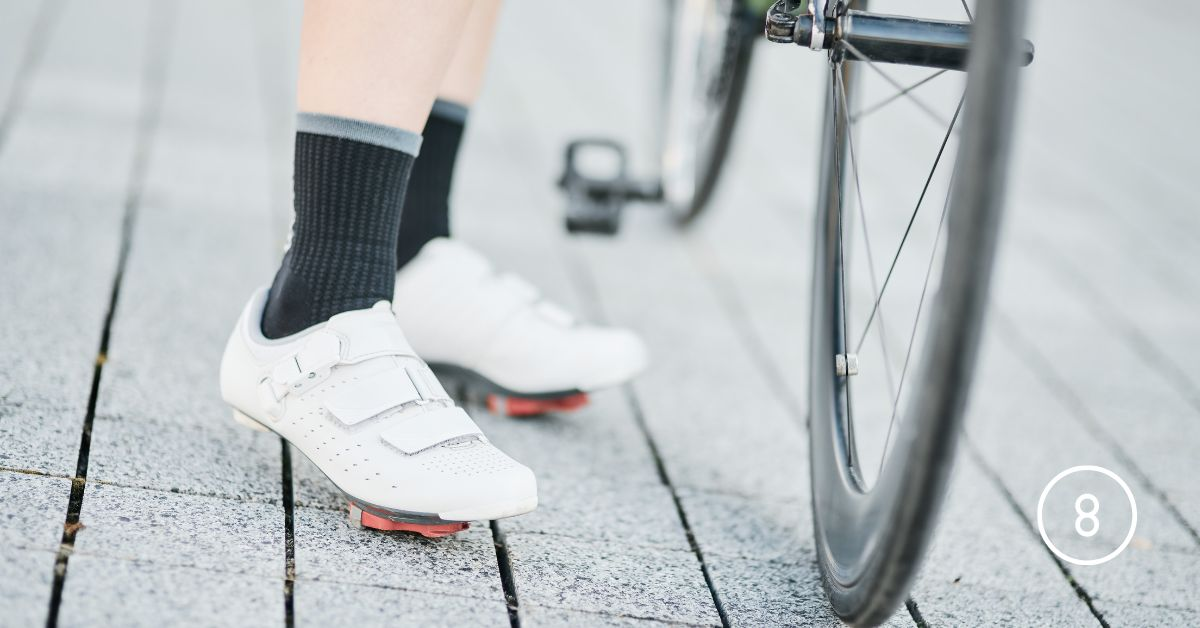 - Walk carefully off the bike — Road cycling cleats stick out below the shoe and are notoriously slippery on smooth floors. Take short steps and watch for wet surfaces.